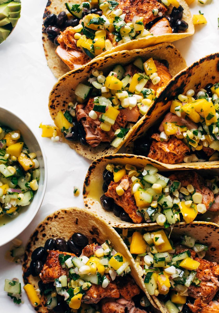 Super easy salmon tacos loaded with a mango, sweet corn, and cucumber salsa!