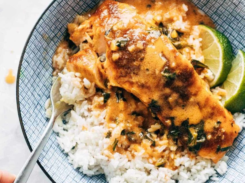 Coconut Curry Salmon! Broiled salmon with a salty-sweet spice rub, creamy coconut curry sauce, and steamy rice to soak it all up.