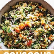 I made this tonight with quinoa instead of couscous and a cilantro vinaigrette instead of basil… it was delicious!!