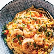 Keywords: corn pasta, summer pasta, tomato pasta, summer produce, creamy pasta, shrimp pasta