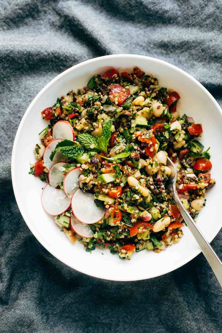 Clean eating with TONS of flavor! cucumbers, tomato, kalamata olives, red onion, mint, parsley, quinoa, and a lemon olive oil drizzle!