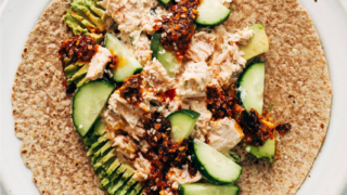 Creamy, crunchy, tangy! It’s a Kimchi Tuna Salad Wrap! Packed with tuna, kewpie mayo, kimchi, avocado, cucumbers, and a bit of chili crisp – all snuggled into a wrap. So, so good!