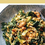 Shredded cabbage and kale, shrimp, avocado, cilantro and chili-flavored peanuts, and the perfect sweet miso dressing.