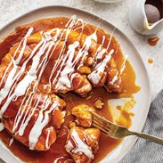 To use with Rhodes frozen dinner rolls: Thaw the rolls for about 45 minutes at room temperature. Cut into 4 pieces, toss with cinnamon sugar and an extra tablespoon or two of melted butter. Transfer to the baking dish and let it sit on the counter for another 1 hour to allow the dough to rise. Once the dough has doubled, pour the sauce over and bake according to the recipe above – adding a few extra minutes if needed.