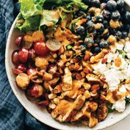 - Cut and prep all the vegetables and fruits. When the chicken is cool enough to handle, cut into bite sized pieces. Place the salad ingredients in a large bowl – you can either arrange the bowl by ingredient, like pictured, or toss everything together. Refrigerate to chill.