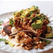 Roasted sweet potatoes topped with creamy chipotle sauce, spicy ground chicken, avocado, cilantro, and pickled onion. My family loves them!