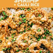 2. Arrange shrimp and peas on top of cauliflower rice. Sprinkle shrimp with salt, pepper, garlic powder, and brush with butter. Bake for another 5-7 minutes.