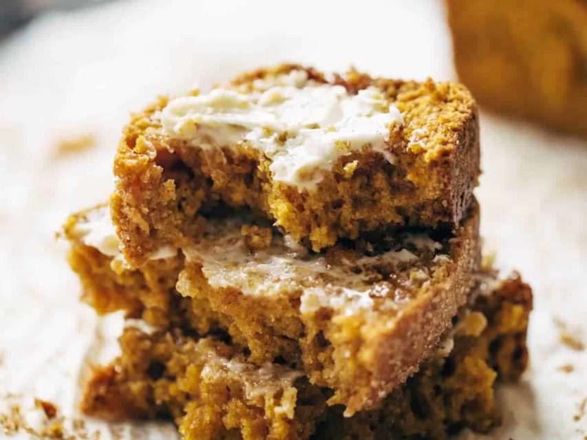 This is an easy, classic, super moist pumpkin bread recipe made with olive oil, pumpkin, and cinnamon, and topped with crunchy turbinado sugar.