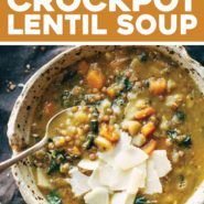 This is called Detox Crockpot Lentil Soup, which means nothing scientifically as you’ll notice that my bowl of DETOX soup is topped with a few thick chunks of Parmesan cheese and served with that addicting crusty-warm bread. Right, about that. We did sneak a few good foods into this soup (kale, onions, garlic, carrots, and olive oil) and anyways, in my book, the best kinds of healthy foods are the ones that ACTUALLY TASTE GOOD.
